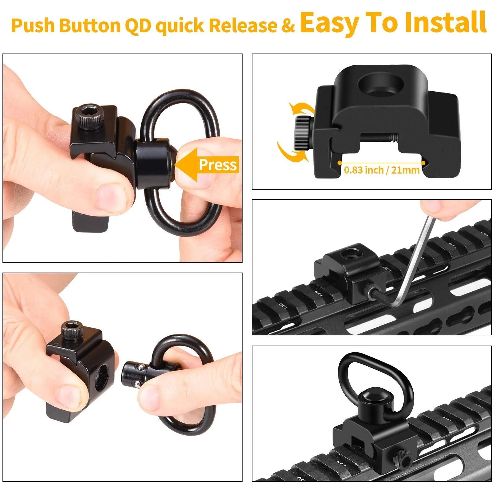 Easy To Install & Remove: QD sling swivel mount is easy to push button for quick detaching and attaching swivel. Tighten the steel bolt by allen wrench tool to lock the mount to the picatinny or weavel rails, simple to install or remove.