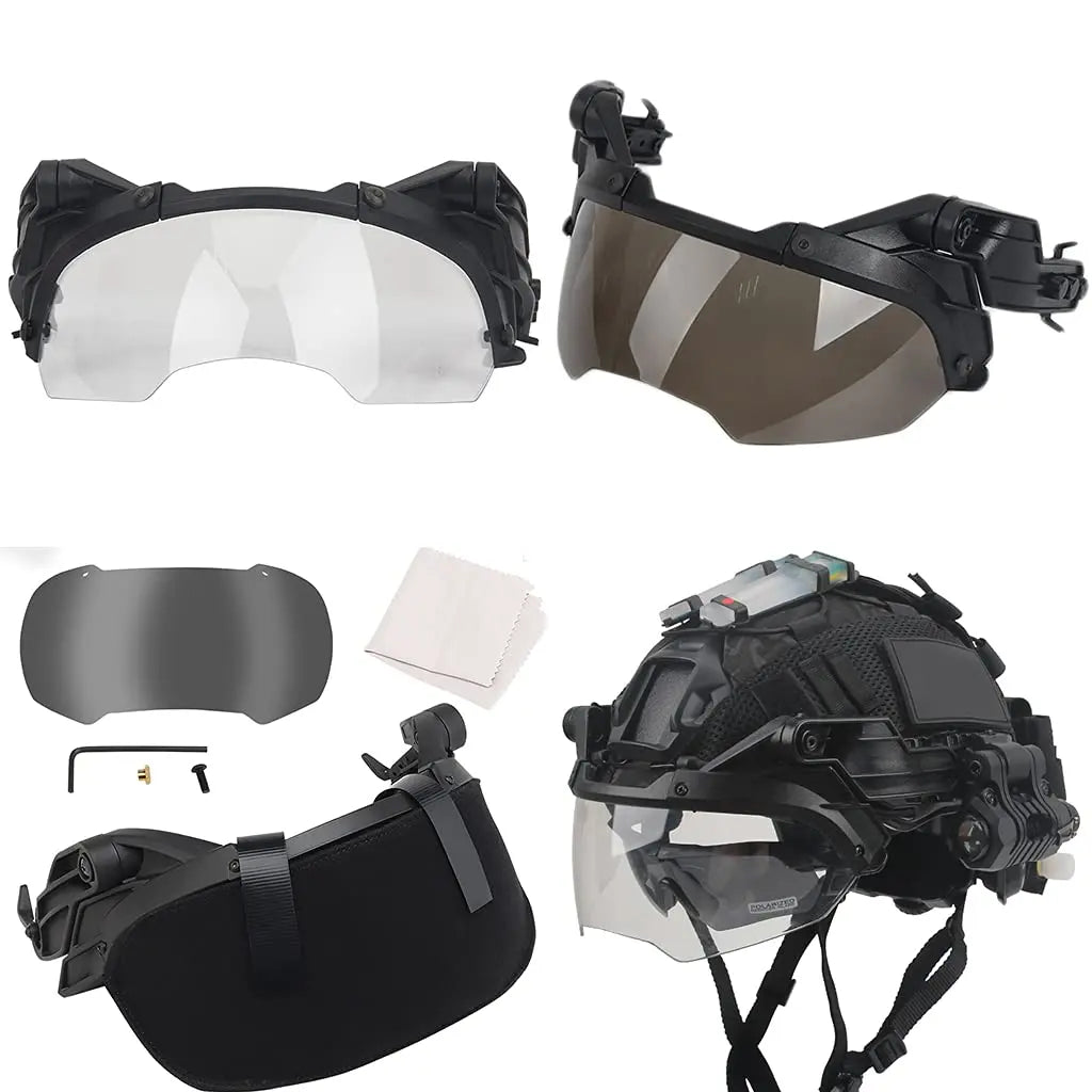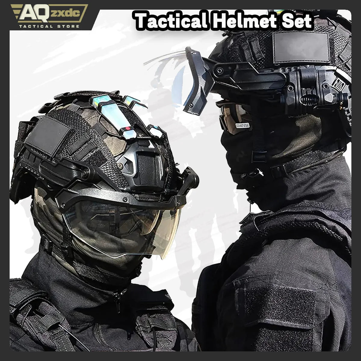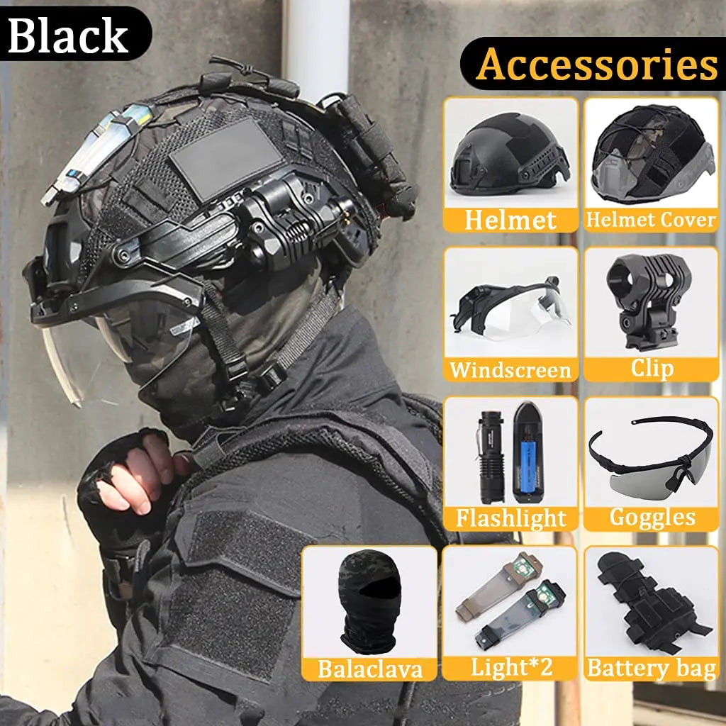 Fast Paintball Helmet, Tactical Protective Sets with Retractable Goggles & Military Flashlights & Signal Lights, for Paintball