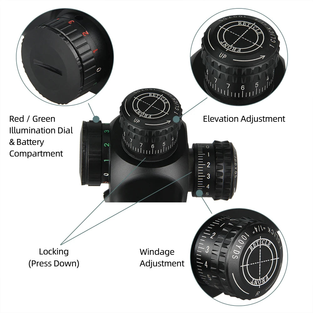 Fine-tune your accuracy easily with 1/4 MOA click adjustments, ensuring precise control over both windage and elevation. Whether you're zeroing at the range or making quick corrections in the field, these tactile clicks provide consistent feedback.