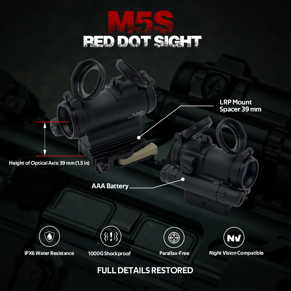 The M5S uses a 2 MOA dot, offering an ideal balance between pinpoint accuracy and fast target transitions. Whether you're tracking moving targets or engaging multiple points quickly, the clear, bright dot ensures confidence shot after shot.