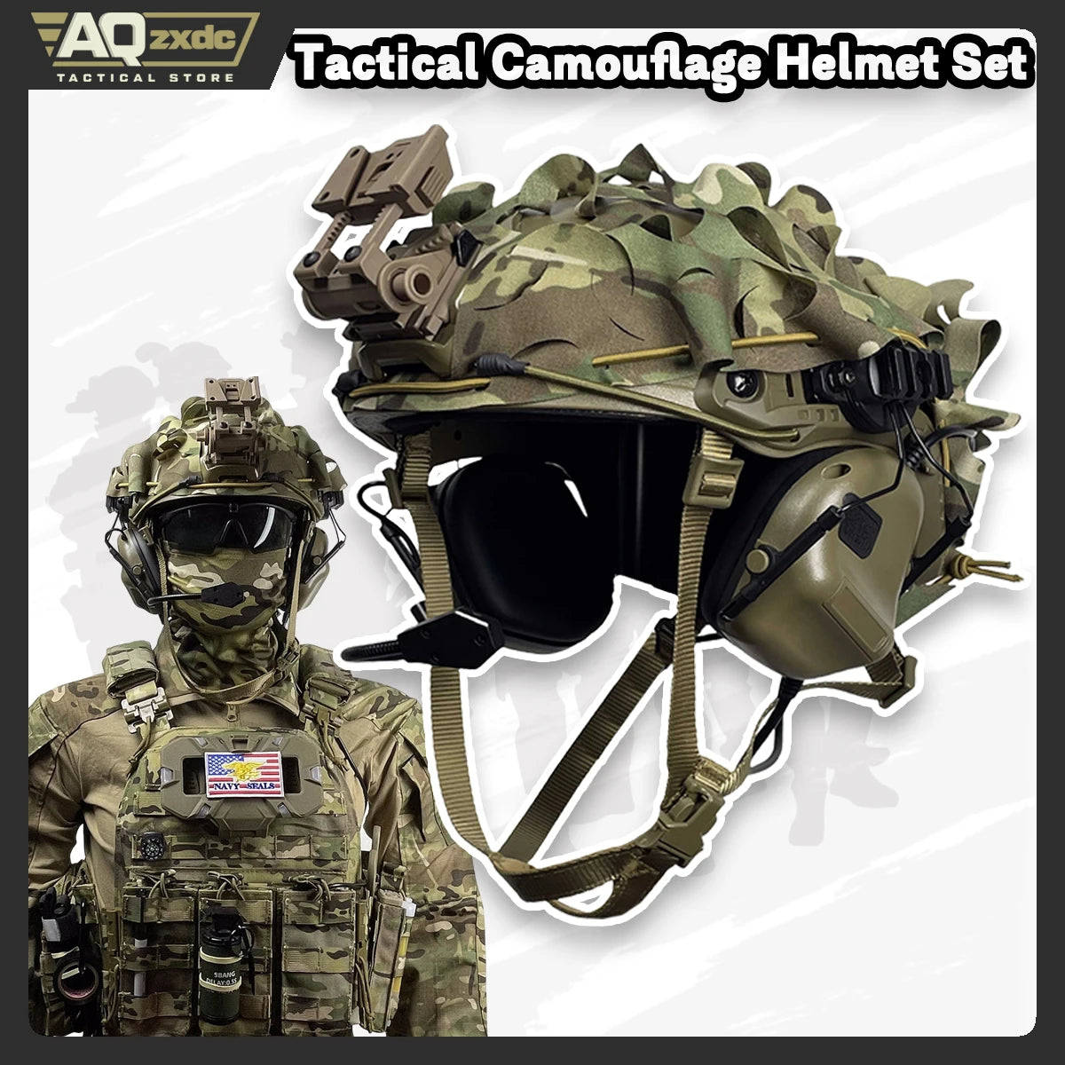 Tactical Helmet Camouflage Cloth Set, with Camouflage Cloth & Airsoft Earphone & Night Vision Mount G24 for Hunting Paintball
